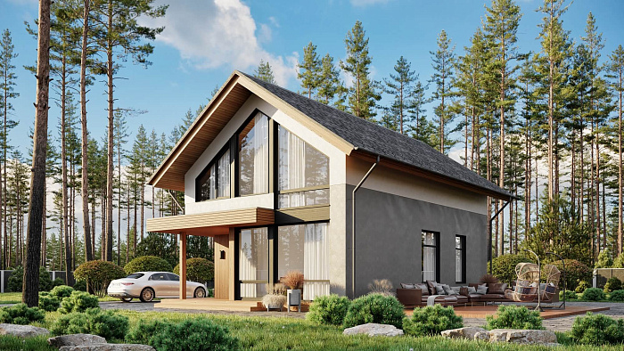 Дом ДАВИНЧИ — воплощенная элегантность. Отделка из древесины золотистого оттенка в сочетании со светлой штукатуркой создают нарядный фасад. А темная раскладка окон дополняет его и задает архитектурный ритм. Основательный и надежный и, в то же время, чувственный и воздушный экстерьер прекрасно вписывается в ландшафт и буквально следует за вашими желаниями. Отлично продумано естественное освещение дома: трехметровые потолки и второй свет в гостиной на первом этаже, потолки по кровле на втором этаже, панорамные окна гостиной добавляют света помещениям второго этажа, в каждом из трех санузлов есть окна. В доме четыре спальни. К главной спальне примыкает собственная ванная комната. Из просторной гостиной зоны через открытую террасу можно выйти в сад. С таким панорамным остеклением кажется, что талантливый художник каждый день пишет уникальный пейзаж на стенах гостиной. Этот интерьер никогда не надоест.