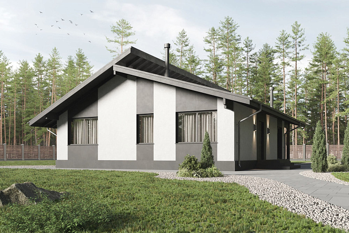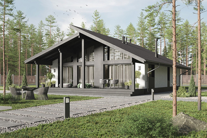 Проект ПИКАССО МИНИ — эффектный, технологичный, функциональный, надежный и компактный. Здесь достаточно места и для общения, и для уединения. Большие панорамные окна создают ощущение свободы и стирают границы между внешним пространством и внутренними помещениями. Слева от входа располагается приватная часть дома: 2 спальни, ванная комната и котельная, а справа — наполненная светом гостиная - кухня и открытая с трех сторон терраса, где вы будете проводить все время, пока позволяет погода.