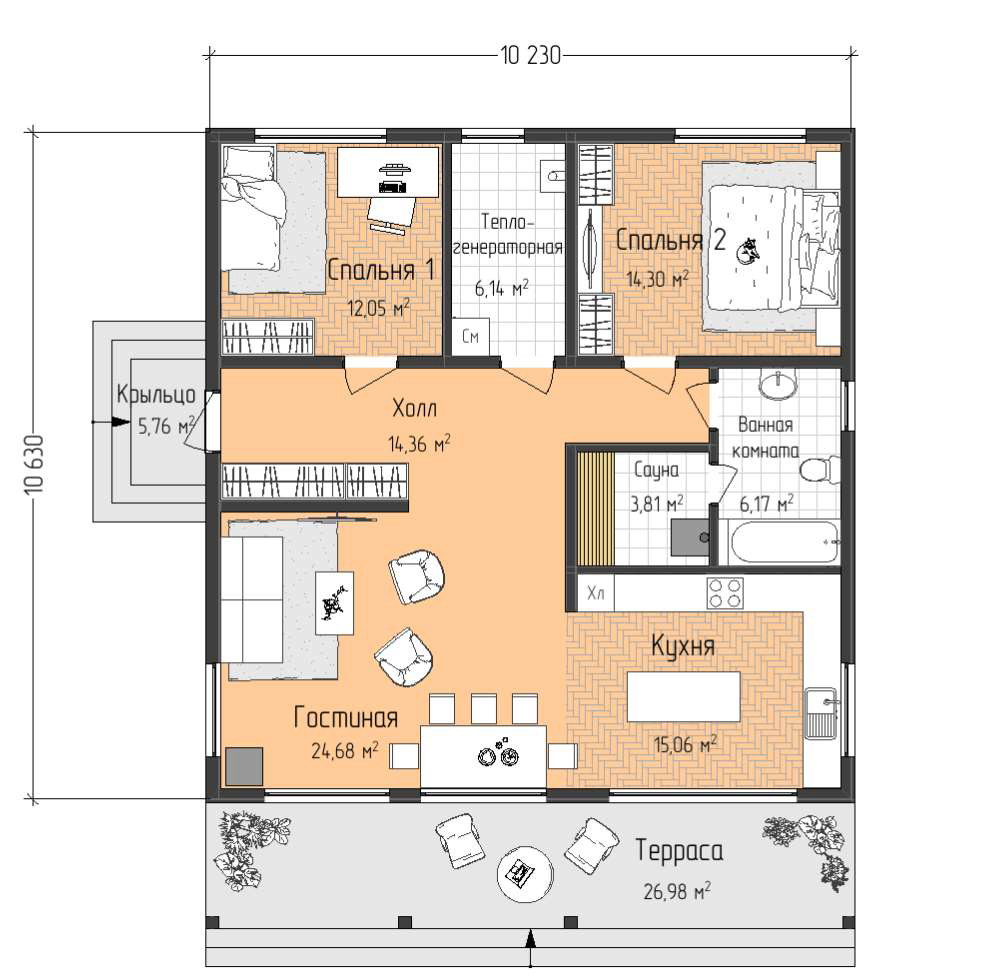 Дом ПИКАССО начинается с просторной входной зоны, слева от которой расположена приватная часть дома: спальни, ванная комната с сауной, котельная, а справа — общественная, которая состоит из большой светлой гостиной - кухни с двумя выходами на террасу. Высокие потолки добавляют помещению объем. Панорамные окна наполняют гостиную светом, а окружающая природа становится частью интерьера. В кухонной зоне хватит места для кухонного острова, а рабочую поверхность можно расположить под окном.