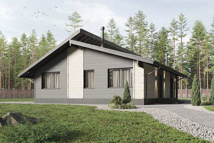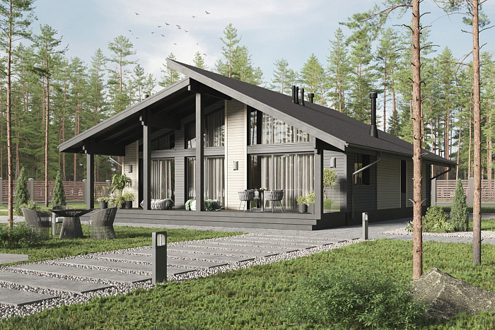 Современный коттедж в скандинавском стиле общей площадью 129 м² с разноуровневой крышей, панорамным остеклением, просторной гостиной, двумя спальнями и большой крытой террасой. Скандинавскому стилю присущи минимализм, строгость форм и линий, панорамные окна, большая терраса, естественные цвета и натуральные материалы.