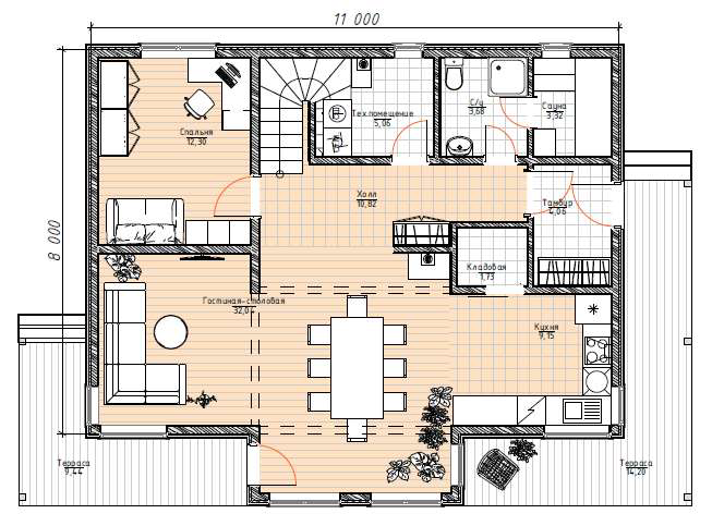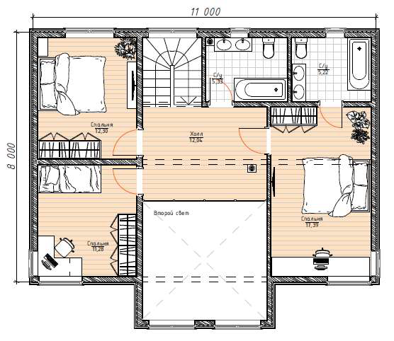 В доме РАФАЭЛЬ большая площадь остекления и второй свет в гостинной зоне, который создает особый объем пространства гостиной и балкона на втором этаже. Архитекторы предусмотрели две планировки — второй свет можно перекрыть, если нужно больше спален.
