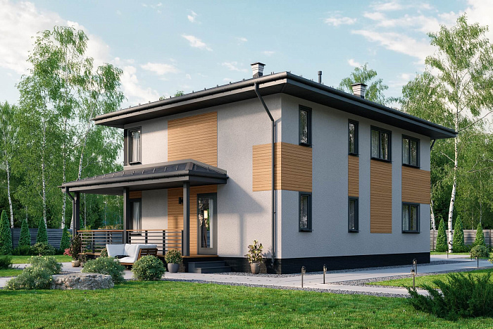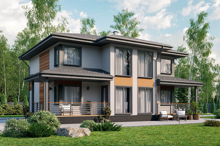 Современный двухэтажный коттедж общей площадью 170 м² с вальмовой кровлей, двумя крытыми угловыми террасами, вторым светом в гостинной зоне и тремя спальнями — все для комфортной жизни за городом в кругу семьи. Здесь хватит места и домочадцам, и домашним питомцам. Интерьер сбалансирован с помощью открытого двусветного пространства гостиной и личного пространства для уединения каждого члена семьи.