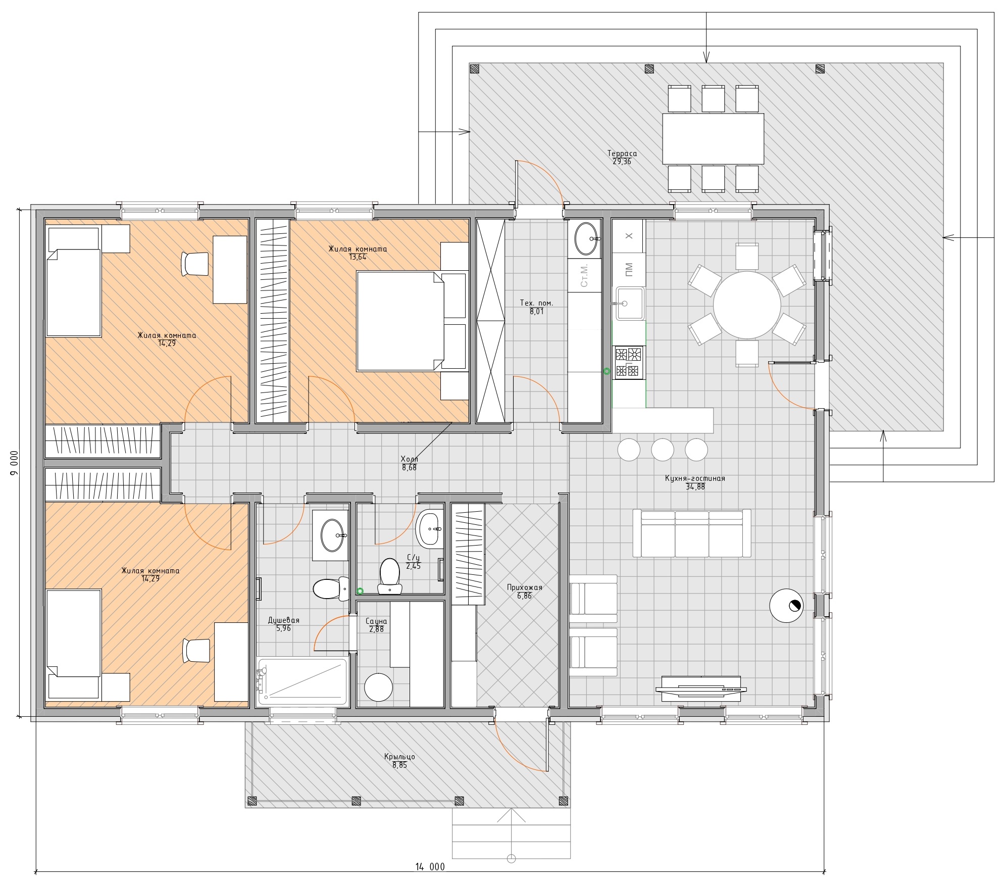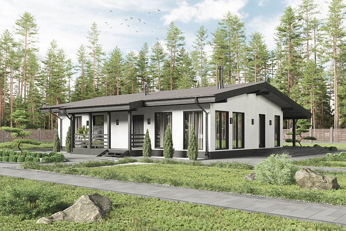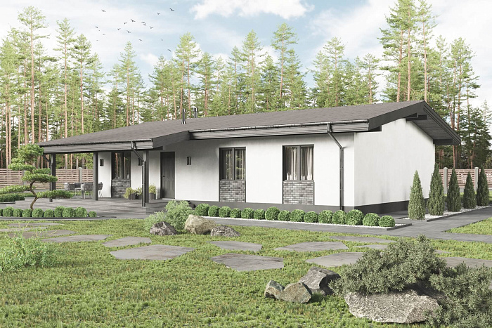 Одноэтажный коттедж в стиле скандинавского минимализма общей площадью 150 м² с двускатной крышей, наполненной светом гостиной, тремя жилыми комнатами и оригинальной террасой. В основе проекта — лаконичность, комфорт и открытость.
