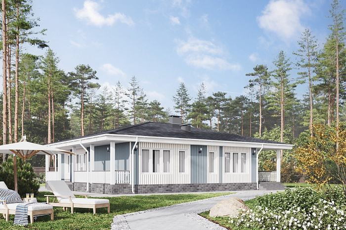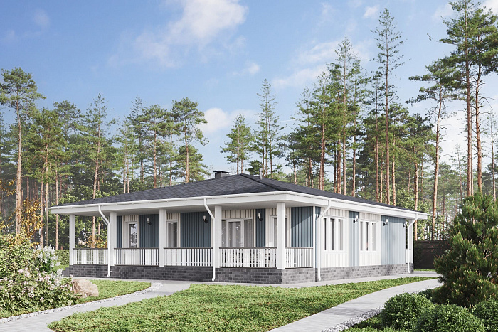 Просторный одноэтажный коттедж общей площадью 152 м² в стиле Райта с вальмовой крышей, большой крытой террасой и просторным крыльцом. Стиль Райта придумал американский архитектор Фрэнк Ллойд Райт. Этот стиль также называют «органическая архитектура». Стиль Райта характеризуют такие архитектурные приемы, как большая площадь остекления, горизонтальная композиция, рациональное расположение комнат, большие крытые террасы и кровля с пологими скатами. Главное в стиле Райта — это гармония с природой.